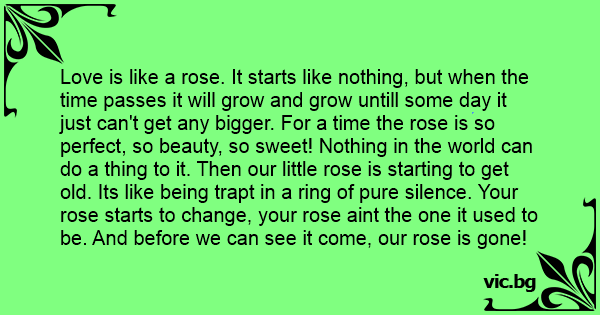 Love is like a rose. It starts like nothing, but when the time passes it will grow and grow untill some day it just can't get any вiggеr. For a time the rose is so perfect, so beauty, so sweet! Nothing in the world can do a thing to it. Then our little rose is starting to get old. Its like being trapt in a ring of pure silence. Your rose starts to change, your rose aint the one it used to be. And before we can see it come, our rose is gone!