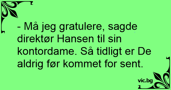 - Må jeg gratulere, sagde direktør Hansen til sin kontordame. Så tidligt er De aldrig før kommet for sent.