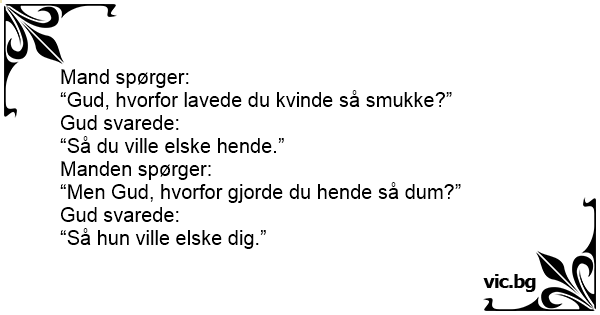 Γυναίκα Adán está en el Edén con Dios y le pregunta: ¿Por qué hiciste a la mujer tan hermosa? Y Dios contesta: Para que te enamores de ella. Y pregunta de nuevo: Pero, ¿Por qué la hiciste tan tonta? Y Dios... Une femme va au ciel et décide d'aller poser deux questions à Dieu. Elle demande donc : - Dieu, pourquoi est-ce que les garçons sont si beaux? Dieu répond : - Eh bien, pour que vous les aimiez.... Un uomo chiese a Dio: “Dio, perche’ hai creato la donna cosi’ bella?”. E Dio: “Cosi’ tu la puoi amare”. E allora l’uomo chiese a Dio: “Ma Dio, perche’ l’hai creata cosi’ stupida?”. E Dio: “Cosi’... Ptá se muž: „Bože, proč jsi učinil ženu tak krásnou?” „Abys ji mohl milovat!” „Ale Bože, proč jsi ji učinil tak hloupou?” „Aby ona mohla milovat tebe!” Adam vraagt aan god: 'Waarom heb je haar zo mooi gemaakt?' God: 'Zodat je van haar zal houden'. Adam: 'Maar waarom heb je haar zo dom gemaakt?' God: 'Zodat ze van jou kan houden'.
