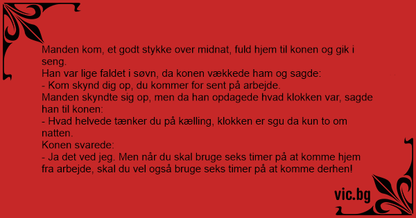 Manden kom, et godt stykke over midnat, fuld hjem til konen og gik i seng.