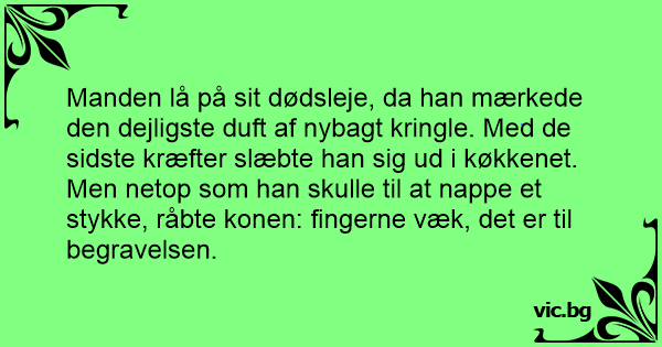Manden lå på sit dødsleje, da han mærkede den dejligste duft af nybagt kringle. Med de sidste kræfter slæbte han sig ud i køkkenet.