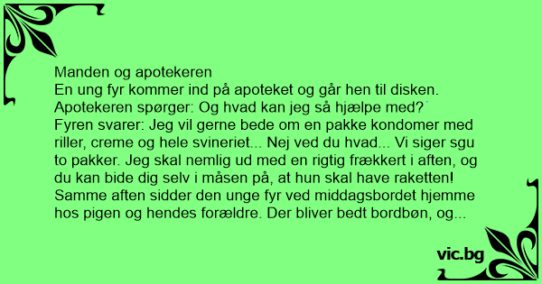 Fyren svarer: Jeg vil gerne bede om en pakke kondomer med riller, creme og hele svineriet... Nej ved du hvad... Vi siger sgu to pakker. Jeg skal nemlig ud med en rigtig frækkert i aften, og du kan bide dig selv i måsen på, at hun skal have raketten!