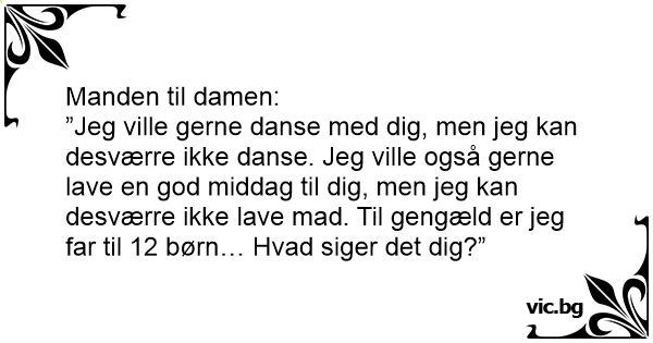 ”Jeg ville gerne danse med dig, men jeg kan desværre ikke danse. Jeg ville også gerne lave en god middag til dig, men jeg kan desværre ikke lave mad. Til gengæld er jeg far til 12 børn… Hvad siger det dig?”