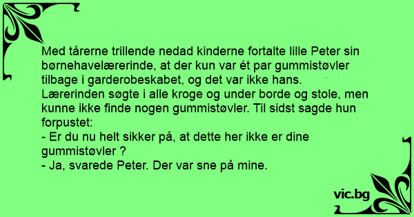 Lærerinden søgte i alle kroge og under borde og stole, men kunne ikke finde nogen gummistøvler. Til sidst sagde hun forpustet: