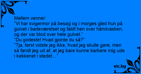 ”Vi har svigermor på besøg og i morges gled hun på gulvet i badeværelset og faldt hen over håndvasken, og der var blod over hele gulvet.”