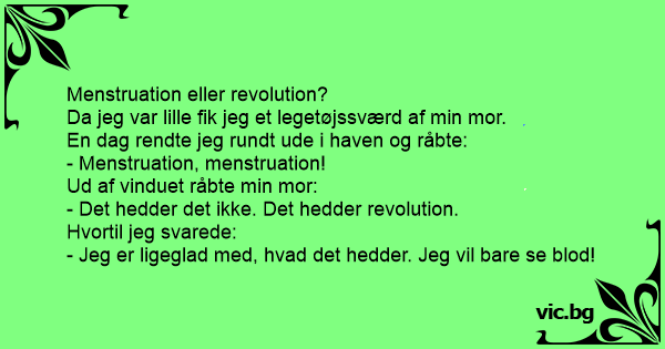 Lille Per løper rundt i stua og vifter med et tresverd og roper: - Menstruasjon, menstruasjon! - Det heter revolusjon, revolusjon, sier moren. - Det driter jeg i, blod er blod!
