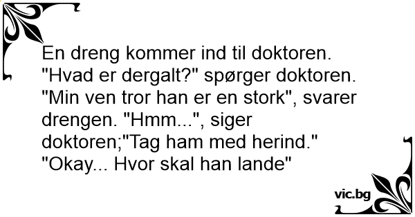 "Min ven tror han er en stork", svarer drengen. "Hmm...", siger doktoren;"Tag ham med herind."
