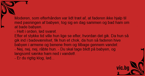Moderen, som efterhånden var lidt træt af, at faderen ikke hjalp til med pasningen af babyen, tog sig en dag sammen og bad ham om at bade babyen.