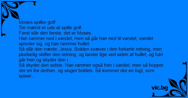 Mooses, Jeesus ja vanha mies oli pelaamassa golfia. Mooses asteli tiille ja löi palloa. Se meni peliväylän ohi ja laskeutui vesiesteeseen. Mooses halkaisi veden ja löi pallon greenille. Jeesus...