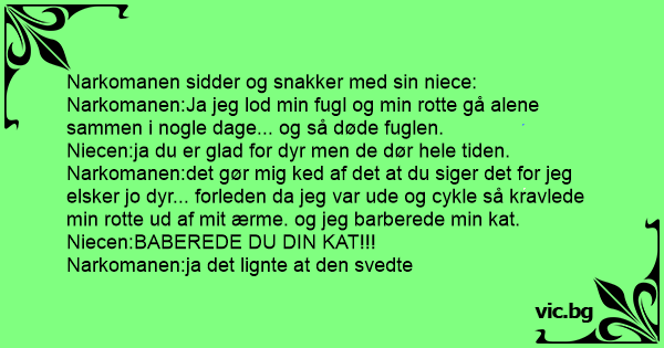 Narkomanen:det gør mig ked af det at du siger det for jeg elsker jo dyr... forleden da jeg var ude og cykle så kravlede min rotte ud af mit ærme. og jeg barberede min kat.