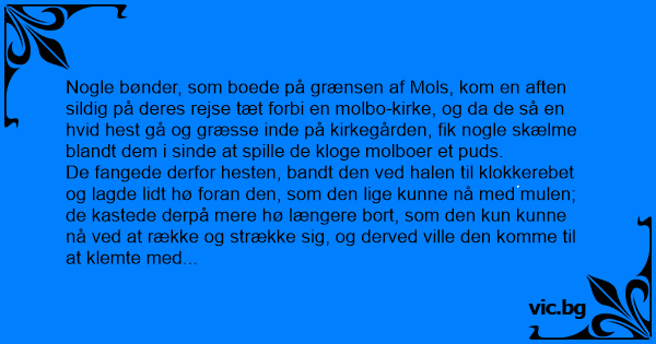 Nogle bønder, som boede på grænsen af Mols, kom en aften sildig på deres rejse tæt forbi en molbo-kirke, og da de så en hvid hest gå og græsse inde på kirkegården, fik nogle skælme blandt dem i sinde at spille de kloge molboer et puds.