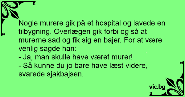 Nogle murere gik på et hospital og lavede en tilbygning. Overlægen gik forbi og så at murerne sad og fik sig en bajer. For at være venlig sagde han:<br />- Ja, man skulle have været murer!<br />- Så kunne du jo bare have læst videre, svarede sjakbajsen.