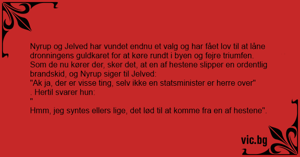 Som de nu kører der, sker det, at en af hestene slipper en ordentlig brandskid, og Nyrup siger til Jelved:
