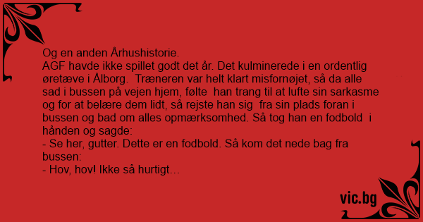 AGF havde ikke spillet godt det år. Det kulminerede i en ordentlig øretæve i Ålborg. Træneren var helt klart misfornøjet, så da alle sad i bussen på vejen hjem, følte han trang til at lufte sin sarkasme og for at belære dem lidt, så rejste han sig fra sin plads foran i bussen og bad om alles opmærksomhed. Så tog han en fodbold i hånden og sagde: