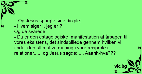 - Du er den estagologiske manifestation af årsagen til vores eksistens, det sindsbillede gennem hvilken vi finder den ultimative mening i vore reciprokke relationer..... og Jesus sagde: .... Aaahh-hva???