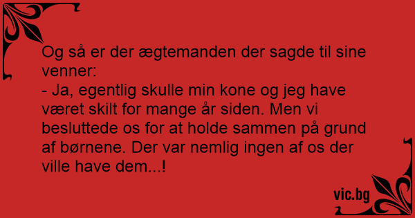 - Ja, egentlig skulle min kone og jeg have været skilt for mange år siden. Men vi besluttede os for at holde sammen på grund af børnene. Der var nemlig ingen af os der ville have dem...!