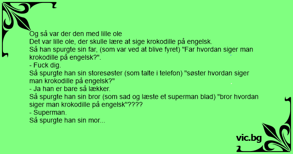 Så næste dag da han kom i skole spurgte læreinden, "nå lille ole hvordan siger man så keokodille på engelsk?"