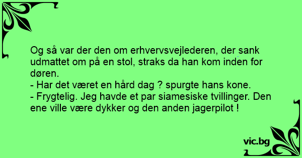 Og så var der den om erhvervsvejlederen, der sank udmattet om på en stol, straks da han kom inden for døren.