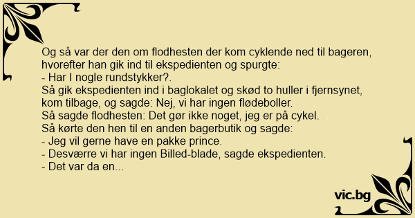 Og så var der den om flodhesten der kom cyklende ned til bageren, hvorefter han gik ind til ekspedienten og spurgte: