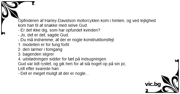 Opfinderen af Harley-Davidson motorcyklen kom i himlen, og ved lejlighed kom han til at snakke med selve Gud.
