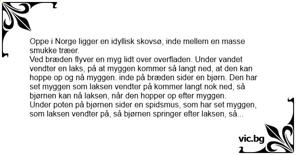 Så sker det. Myggen flyver ned til vandoverfladen, laksen hopper op, bjørnen springer og musen løber. Katten springer frem mod musen, men glider på en sten og falder i vandet.