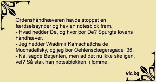 - Jeg hedder Wiadimir Kamschattcha de Muchadellsky, og jeg bor Oehlensclægersgade 36.
