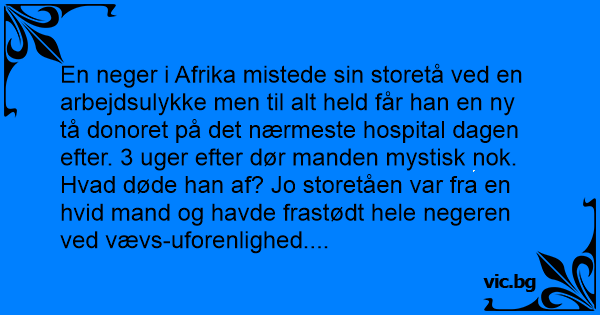 Hvad døde han af? Jo storetåen var fra en hvid mand og havde frastødt hele negeren ved vævs-uforenlighed....