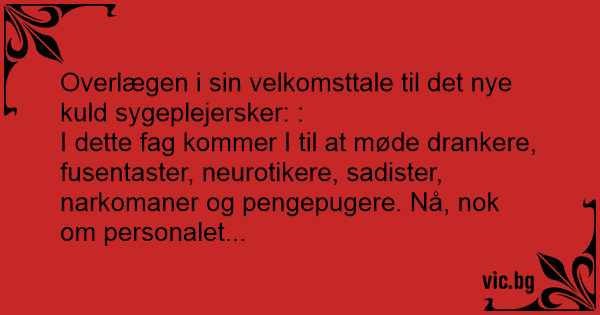 I dette fаg kommer I til at møde drankere, fusentaster, neurotikere, sadister, narkomaner og pengepugere. Nå, nok om personalet...