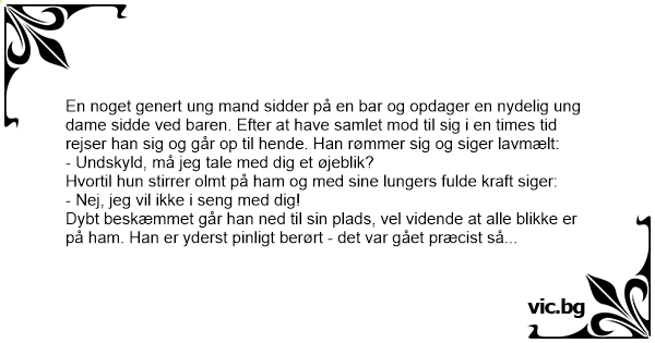 En noget genert ung mand sidder på en bar og opdager en nydelig ung dame sidde ved baren. Efter at have samlet mod til sig i en times tid rejser han sig og går op til hende. Han rømmer sig og siger lavmælt:
