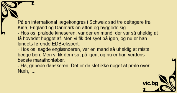 På en international lægekongres i Schweiz sad tre deltagere fra Kina, England og Danmark en aften og hyggede sig.