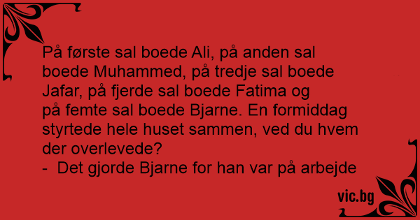 På første sal boede Ali, på anden sal boede Muhammed, på tredje sal boede Jafar, på fjerde sal boede Fatima og på femte sal boede Bjarne. En formiddag styrtede hele huset sammen, ved du hvem der overlevede?