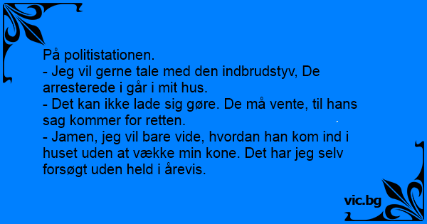 På politistationen. - Jeg vil gerne tale med den indbrudstyv, De arresterede i går i mit hus. - Det kan ikke lade sig gøre. De må vente, til hans sag kommer for retten. - Jamen, jeg vil bare vide, hvordan han kom ind i huset uden at vække min kone. Det har jeg selv forsøgt uden held i årevis.