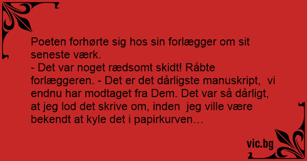 - Det var noget rædsomt skidt! Råbte forlæggeren. - Det er det dårligste manuskript, vi endnu har modtaget fra Dem. Det var så dårligt, at jeg lod det skrive om, inden jeg ville være bekendt at kyle det i papirkurven…