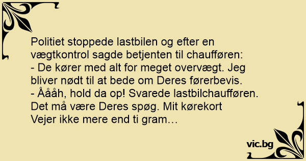 Politiet stoppede lastbilen og efter en vægtkontrol sagde betjenten til chaufføren: - De kører med alt for meget overvægt. Jeg bliver nødt til at bede om Deres førerbevis. - Åååh, hold da op! Svarede lastbilchaufføren. Det må være Deres spøg. Mit kørekort Vejer ikke mere end ti gram…