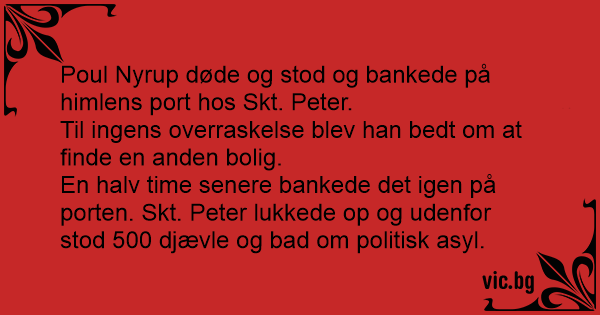 En halv time senere bankede det igen på porten. Skt. Peter lukkede op og udenfor stod 500 djævle og bad om politisk asyl.