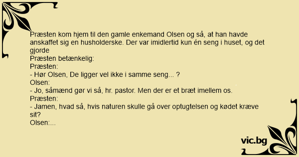 Præsten kom hjem til den gamle enkemand Olsen og så, at han havde anskaffet sig en husholderske. Der var imidlertid kun én seng i huset, og det gjorde