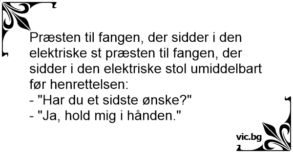 Fången har tagit plats i elektriska stolen och prästen frågar: - Har du någon sista önskan? - Jaa, håll mig i handen...