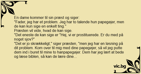 "Det er jo skrækkeligt," siger præsten, "men jeg har en løsning på dit problem. Kom over til mig med dine papegøjer, så vil jeg putte dem ind i buret til mine to hanpapegøjer. Dem har jeg lært at bede og læse biblen, så kan de lære dine papegøjer at holde op med at benytte et sådant skrækkeligt sprog."