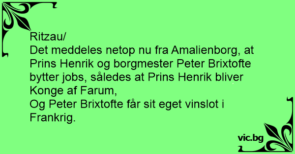 Det meddeles netop nu fra Amalienborg, at Prins Henrik og borgmester Peter Brixtofte bytter jobs, således at Prins Henrik bliver Konge af Farum,