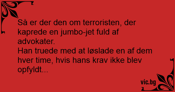 Så er der den om terroristen, der kaprede en jumbo-jet fuld af advokater.