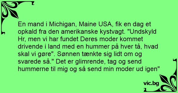 En mand i Michigan, Maine USA, fik en dag et opkald fra den amerikanske kystvagt. "Undskyld Hr, men vi har fundet Deres moder kommet drivende i land med en hummer på hver tå, hvad skal vi gøre". Sønnen tænkte sig lidt om og svarede så." Det er glimrende, tag og send hummerne til mig og så send min moder ud igen"
