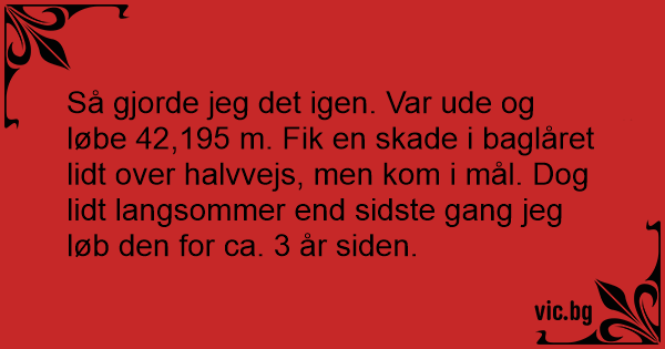 Så gjorde jeg det igen. Var ude og løbe 42,195 m. Fik en skade i baglåret lidt over halvvejs, men kom i mål. Dog lidt langsommer end sidste gang jeg løb den for ca. 3 år siden.