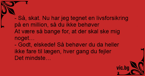 - Så, skat. Nu har jeg tegnet en livsforsikring på en million, så du ikke behøver
