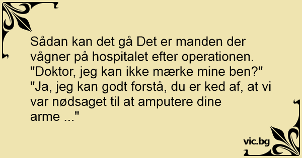 Patienten vaknar upp ur narkosen och ropar förtvivlat: - Doktorn, doktorn, vad har ni gjort???? Jag kan inte känna mina ben... Doktorn: - Det är inte så konstigt, vi har amputerat dina armar...