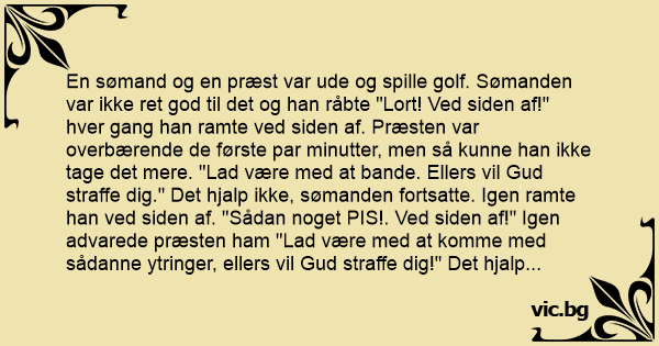 En sømand og en præst var ude og spille golf. Sømanden var ikke ret god til det og han råbte "Lоrт! Ved siden af!" hver gang han ramte ved siden af. Præsten var overbærende de første par minutter, men så kunne han ikke tage det mere. "Lad være med at bande. Ellers vil Gud straffe dig." Det hjalp ikke, sømanden fortsatte. Igen ramte han ved siden af. "Sådan noget PIS!. Ved siden af!" Igen advarede præsten ham "Lad være med at komme med sådanne ytringer, ellers vil Gud straffe dig!" Det hjalp stadig ikke. Ved det næste slаg ramte sømanden ved siden bolden, fulgt af et "Sådan noget fоrрulет lоrт!" Et lyn slog ned og ramte præsten, som faldt død om på stedet. Så hørte man en dyb stemme fra himlen "Pis! Ved siden af!"
