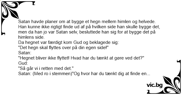 Sатаn havde planer om at bygge et hegn mellem himlen og helvede. Han kunne ikke rigtigt finde ud af på hvilken side han skulle bygge det, men da han jo var Sатаn selv, besluttede han sig for at bygge det på himlens side.
