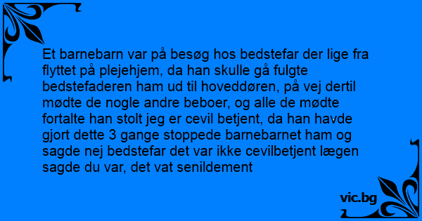 Et barnebarn var på besøg hos bedstefar der lige fra flyttet på plejehjem, da han skulle gå fulgte bedstefaderen ham ud til hoveddøren, på vej dertil mødte de nogle andre beboer, og alle de mødte fortalte han stolt jeg er cevil betjent, da han havde gjort dette 3 gange stoppede barnebarnet ham og sagde nej bedstefar det var ikke cevilbetjent lægen sagde du var, det vat senildement