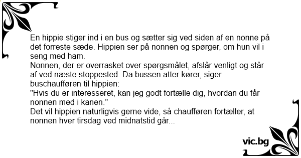 Nunnan åkte buss och sade till chauffören: - Innan jag dör så vill jag göra det. Men bara om ni är ogift. - Jag är inte gift ljög chaffisen. Nunnan: - Men jag måste dö oskuld så det får bli där...