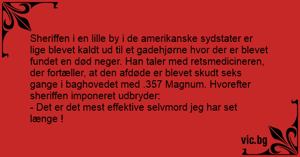 Türke mit 23 Schusswunden Някъде из щата Тексас лежи труп на негър. Im Süden der USA liegt ein toter Farbiger auf der Straße. Der Sheriff untersucht die Leiche, findet 23 Einschussstellen und sagt: "Mein Gott, so einen abartigen Selbstmord habe ich lange nicht gesehen!" Два белокожих полицейских патрулируют район, где проживает исключительно белые люди. Находят они в подворотне, черного с 22 пулевыми ранениями. Старший полицейский: - Смотри, как изощренно он... Amerikkalaisen kaupungin kujalta löytyi kuolleen mustan miehen ruumis. Siinä oli 77 luodinreikää ja 33 puukoniskua. Poliisipäällikkö katsoi miestä ja totesi: ”Ehdottomasti pahin näkemäni itsemurha.” Hvad sagde, Sheriffen fra Alabama, om negeren der var blevet skudt 15 gange ? - At det var det værste tilfælde af selvmord, han nogensinde havde set… In anul 1854 este gasit un negru mort cu 18 glonte in spate. Seriful face constatarea si zice : - MMAAAAMAAAA ,asa sinucidere n-am mai intalnit. Нашле црнец во пустина, мртов со 14 прострелни рани во телото. На тоа шерифот: Ова е најлошиот случај на самоубиство досега што сум го видел!!! What did the texas sheriff say when he saw a dead black guy with 32 bullet-holes in him? Worst case of suicide i’ve ever seen.