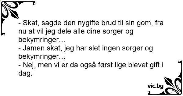 - Skat, sagde den nygifte brud til sin gom, fra nu at vil jeg dele alle dine sorger og bekymringer…